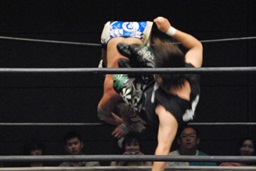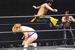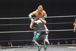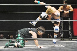 2回転コルバタ(右写真)。ストンピング、彰人にタッチ。