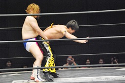 ロープ際で踏みつけ(右写真)。KUDOにタッチ。KUDOエプロンからトップロープ越えのダブルニードロップ、カウント2。ウラノにタッチ。