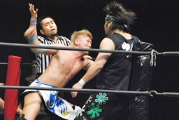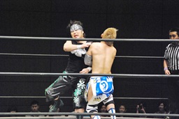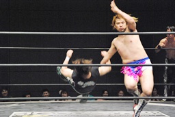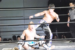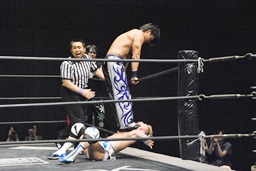 HARASHIMAストンピング、首投げからサッカーボールキック(左写真)、カウント2。KUDOにタッチ。