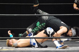 彰人ボディスラム、カウント2。スリーパー(左写真)、ディーノにタッチ。ディーノ何もせずに大石にタッチ。