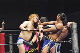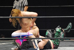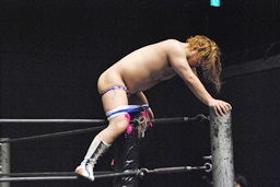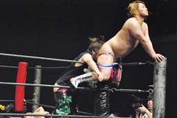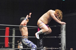 しかしその背後からHARASHIMAドロップキック、彰人ディーノの尻に突っ込む(左写真)。