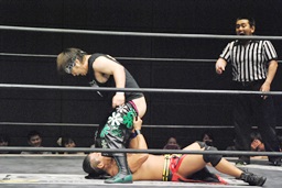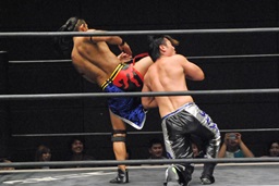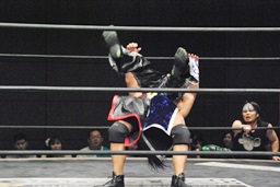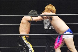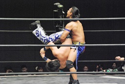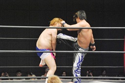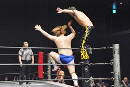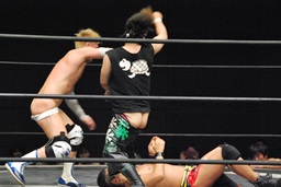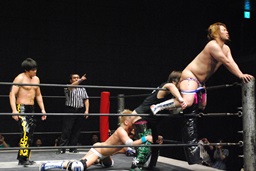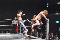 KUDOダイビングダブルニーアタック(左写真)、カウント2。KUDOはHARASHIMAにタッチ。