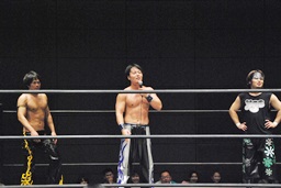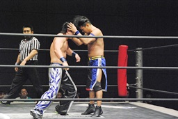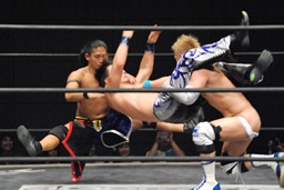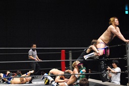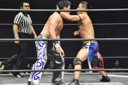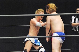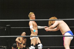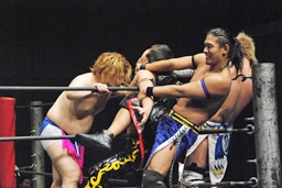 HARASHIMAがエルボー(左写真)、ディーノはウラノの顔面に座る、カウント2。ウラノはKUDOにタッチ。