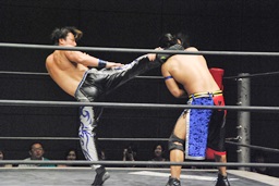 KUDOスワンダイブミサイルキック(右写真)、