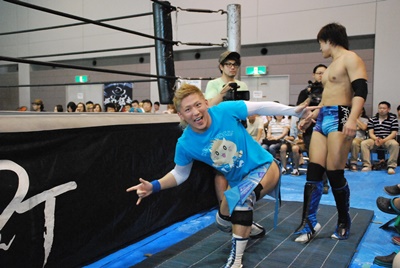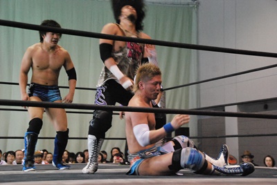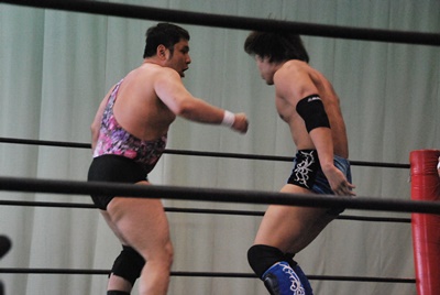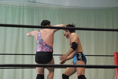 佐々木マシンガン(左写真)、カバーは大石がカット。アントン大石にパンチ、大石場外まで吹っ飛ぶ。