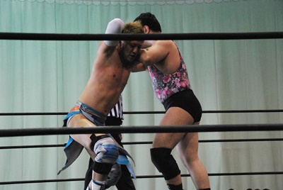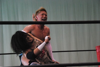 ロープに飛ぶ、佐々木が足引っ張る、アントンニースタンプ(左写真)、佐々木を呼び込む。ダブルのガットショットから佐々木がDDT、アントンニースタンプ、佐々木カバー、カウント2。