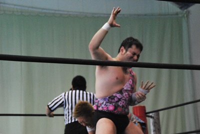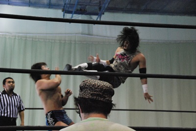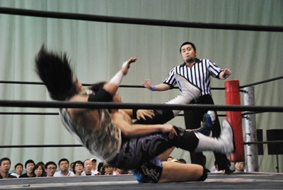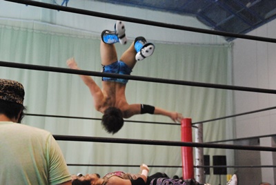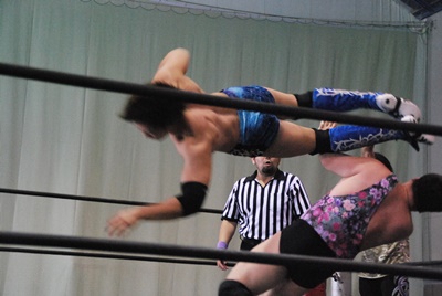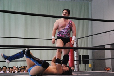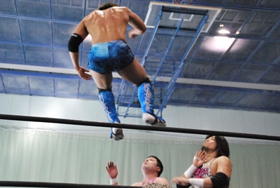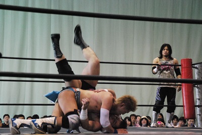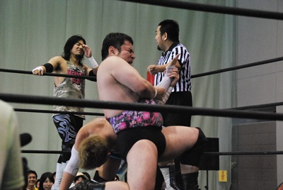 アントン首投げからスリーパー、大石切り返してフライングメイヤー(右写真)、アントンヘッドシザーズで返す。アントンフライングメイヤー、大石もヘッドシザーズ、ブレーク、両軍タッチ。