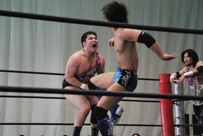 佐々木遠藤をロープに振ってドロップキック(左写真)、カウント2。5分経過。