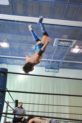 遠藤ボディスラムからコーナーに上ってムーンサルトプレス(左写真)、佐々木かわす。