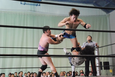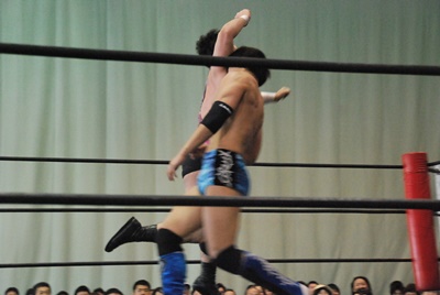 ロックアップ、佐々木パンチ、遠藤かわしてロープワーク、リープフロッグからドロップキック(左写真)。