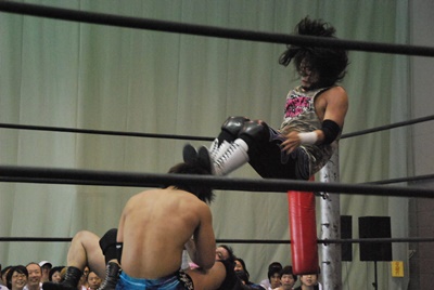 遠藤延髄蹴りはスカされるがドロップキックをヒット(右写真)、大石にタッチ。