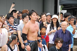 もう一段で完成、ということで四方の客に記念撮影撮らせる大社長(右写真)。
