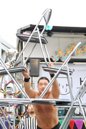 イスごとエビに固め(右写真)、松井レフェリーが赤ちゃん小脇に抱えてカウント3。