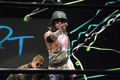 佐々木入場すると手で拳銃の形を作る(右写真)。バレットクラブ?