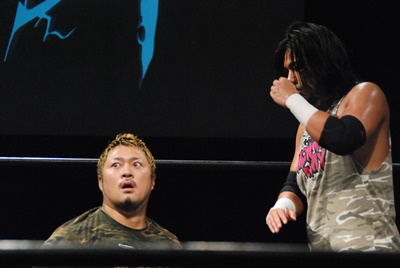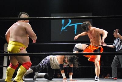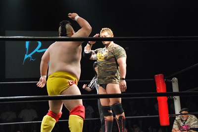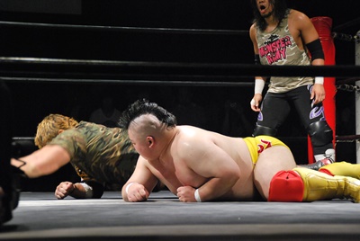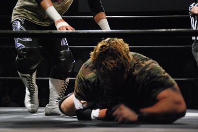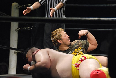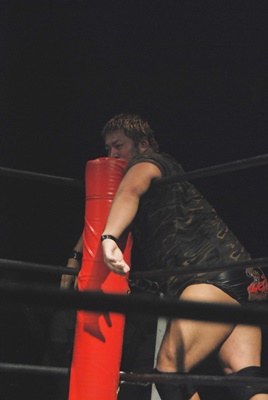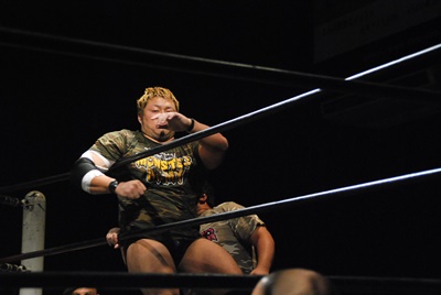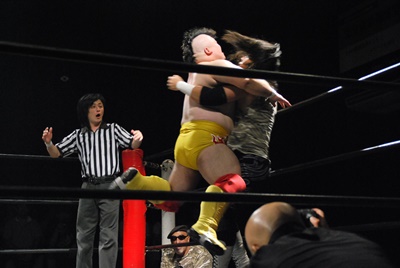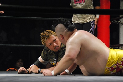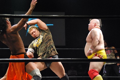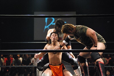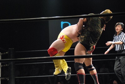 佐々木がキャメルクラッチ、火野が逆水平(左写真)。