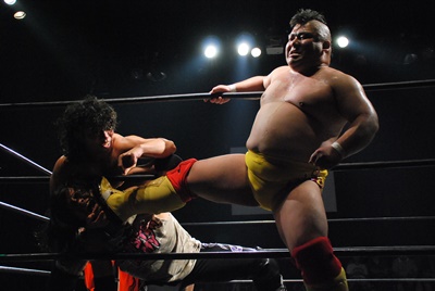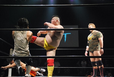 かなり遅れて伊橋のテーマ。伊橋はフードコートから入場、佐々木にミドルキック(右写真)。アップもできない忙しさのシェフレスラー。