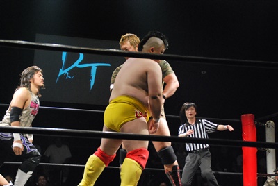 高梨火野に逆水平(右写真)、チョップ、火野は逆水平一発、カウント2。佐々木にタッチ。