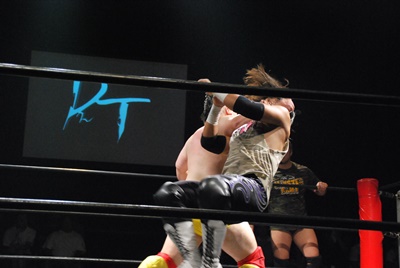 佐々木ボディスラム、カウント2。ロープに振る、高梨切り返して鼻をつまみチョップ。さらに佐々木の顔面にドロップキック(左写真)、伊橋にタッチ。