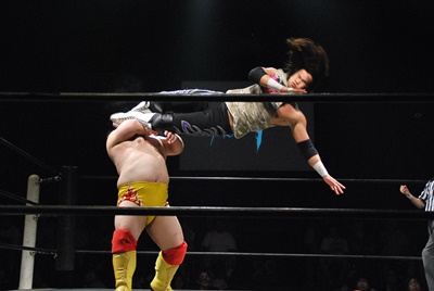 伊橋ロープに飛ぶ、佐々木カウンターのドロップキック(右写真)。