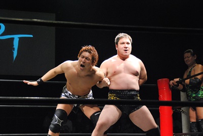 アントンボディにパンチ、平田チョップで返す。平田フライングエルボー(右写真)、大鷲にタッチを求める。大鷲今度は拒否できずタッチ。