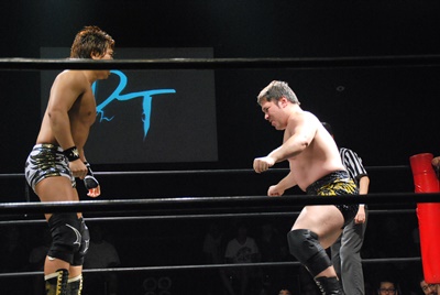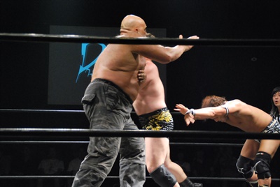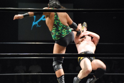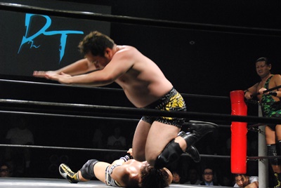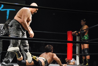 アントン平田の顔面をターンバックルにぶつけ、首投げからニースタンプ(左写真)、カウント2。5分経過。