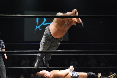 大鷲は平田の命令でコーナーに上ってダイビングフィストドロップの体勢(左写真)。