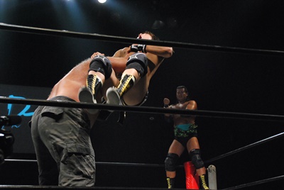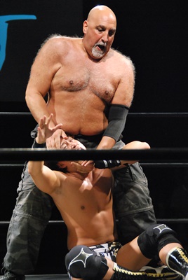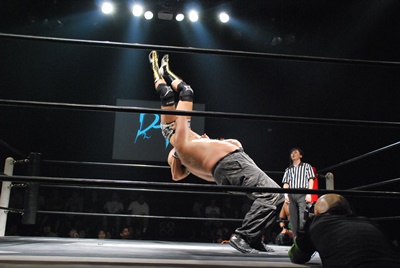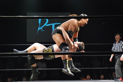 平田が大鷲にタッチしようとするが大鷲は拒否、アントン首投げからフェースカット、星誕期にタッチ。平田つかまる(右写真)。星誕期ボディスラム連発からエルボードロップ、カウント2。