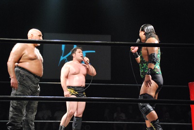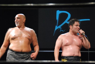 大鷲が映像を使って高木&大鷲のパートナーを発表。それは元大相撲第64代横綱・曙!(左写真)