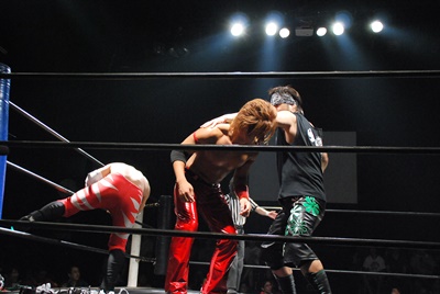 KUDOとFUMAがコーナーに振って突っ込む、高尾はFUMAにカウンターのキックから背中にダブルフットスタンプ、KUDOにはスイングDDT(右写真)。