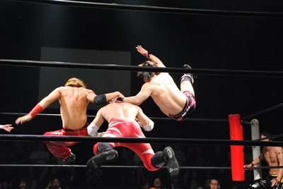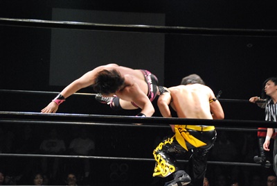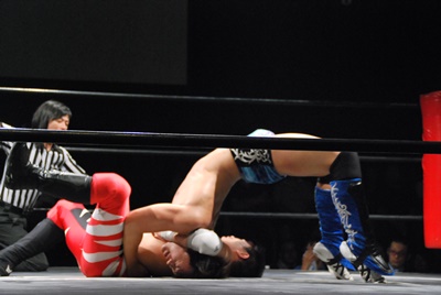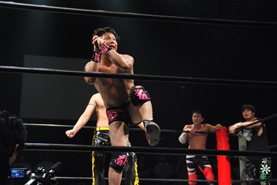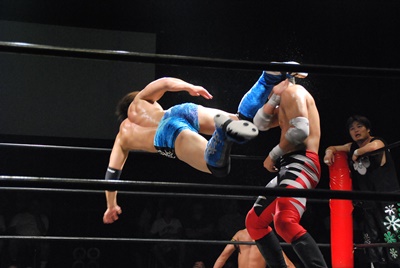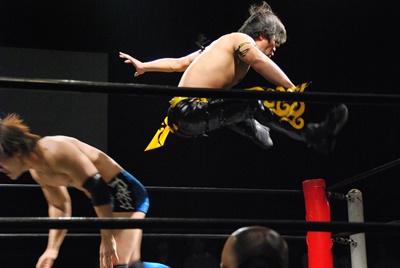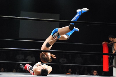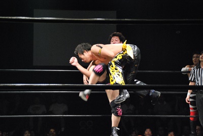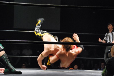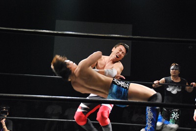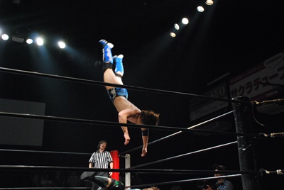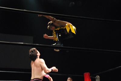 遠藤が入り首投げからサマーソルトドロップ(右写真)、カウント2。高尾にタッチ。高尾ガットショット、ボディスラム、カウント2。また遠藤にタッチ。