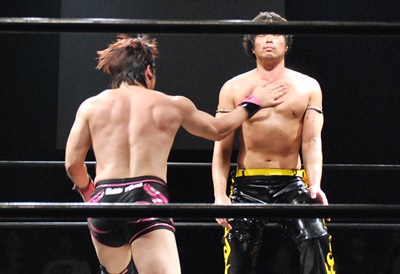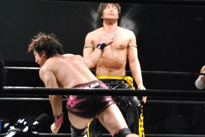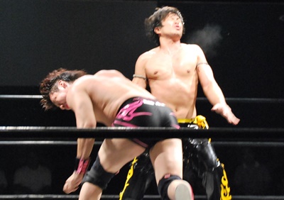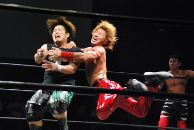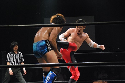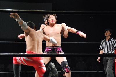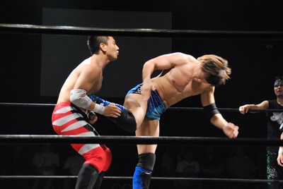 KUDOアームドラッグ、遠藤ドロップキック(右写真)。
