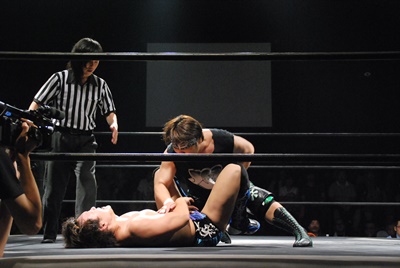 ウラノ首固め(左写真)、高尾カウント1で返すと逆に首固め、カウント2。