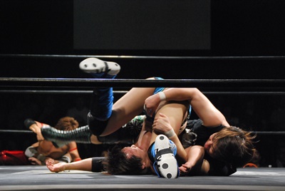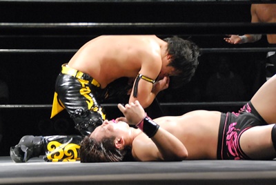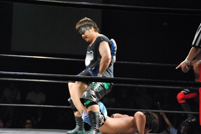 ボディスラム2発から逆エビ固め(右写真)、遠藤脚力でハネ返しドロップキック、高尾にタッチ。
