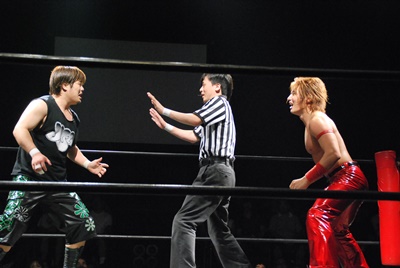高尾延髄蹴り、ウラノブロック。ウラノ木曽レフェリーを巻き込む(右写真)。