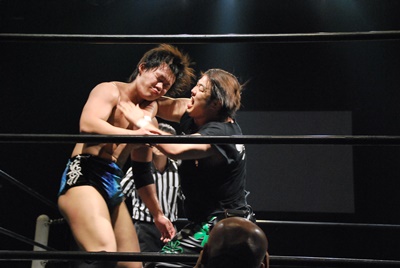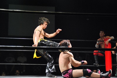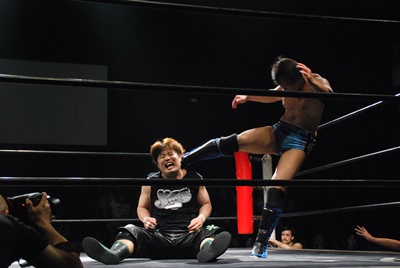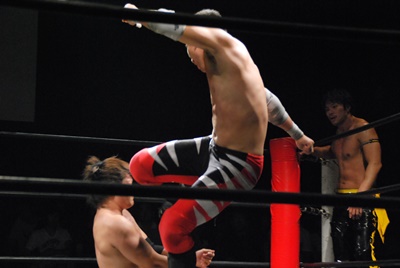 しかし高尾が延髄蹴りヒット(左写真)、石井を呼び込んでウラノをロープに振るとダブルのドロップキック、ウラノかわしてKUDOにタッチ。