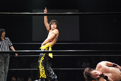 KUDO石井にスワンダイブミサイルキック(右写真)、コーナーに振って8×4からコーナーに上ってダイビングダブルニーアタック、カウント2。