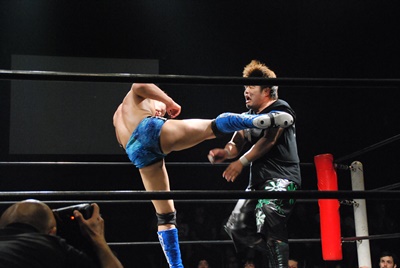ウラノが後頭部にドロップキック、FUMAは前からランニングローキック(右写真)、ウラノカバー、カウント2。