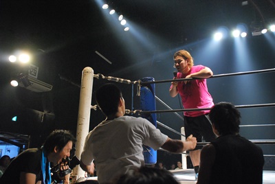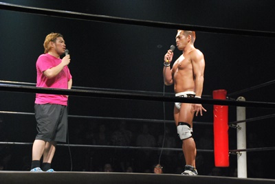 ディーノはニコ生放送中の鶴見亜門GMをリングに呼んで「叩き直す試合」の許可を取り付ける(右写真)。