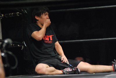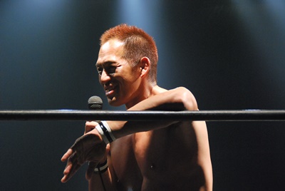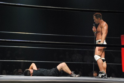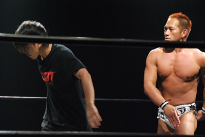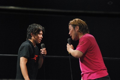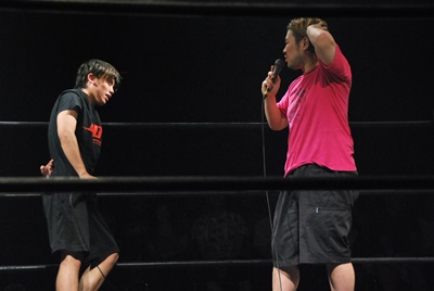マイケル勝俣を見下ろし「俺はクズだよ。プロレスに夢持ってない、惰性でやってますよ。俺に夢がなくても、DDTには夢がある。俺は飯伏さん、ケニー、ひかるんみたいに夢を与える人にくっついてコバンザメで8年やって来たんだ。お前らみたいにDDTが大きくなって、両国や武道館やるようになってから入ったやつには5年経とうが10年経とうが負ける気はしねーよ。」(左写真)