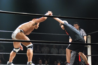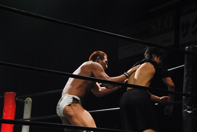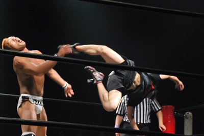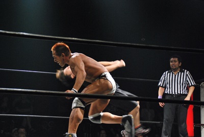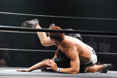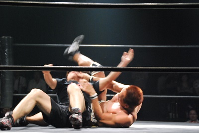 フライングメイヤーとヘッドシザーズの攻防(右写真)、ブレーク。