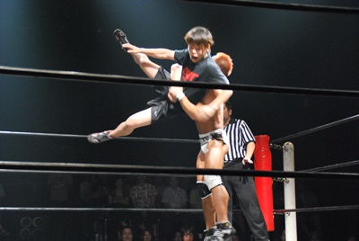 勝俣はドロップキック3連打(右写真)、カバーに行くがカウント1。