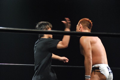 マイケルロープに振る、勝俣ブロック。マイケル逆水平打ち込んでロープに振る、勝俣切り返してドロップキック、マイケルスカしラリアット(左写真)、カウント2。
