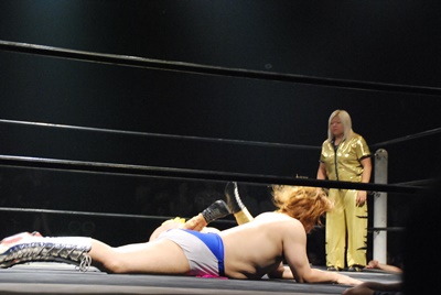 ロープワーク、ホーガンディーノにつまづいてコケる(右写真)。