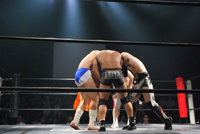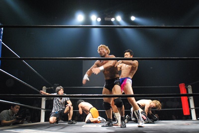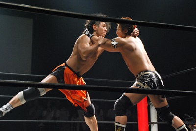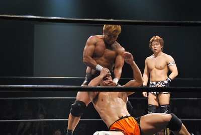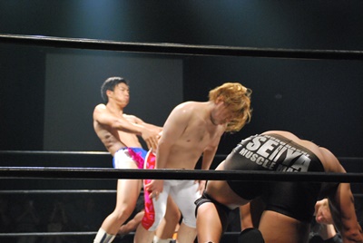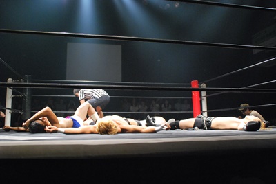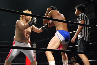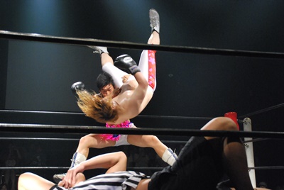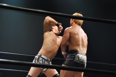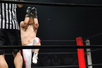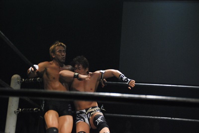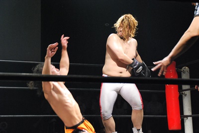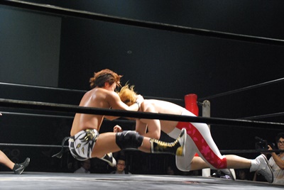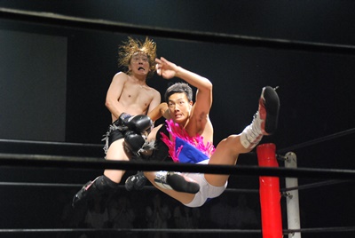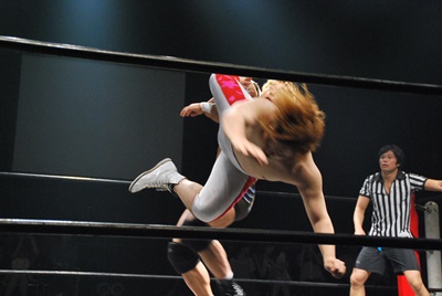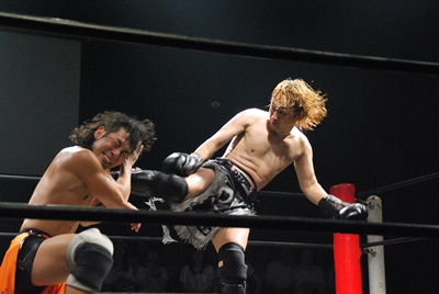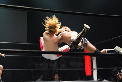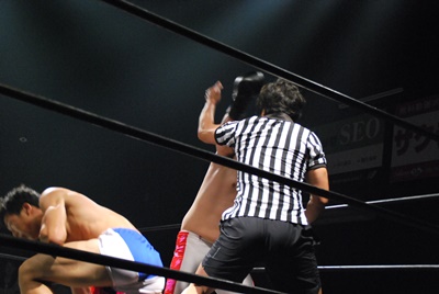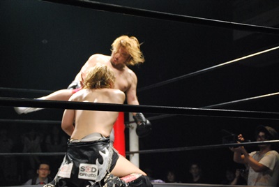 竹下はドロップキックからブルーサンダー(右写真)、KUDOカウント取れず。