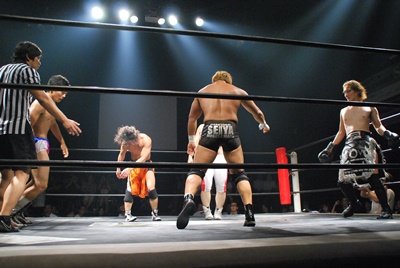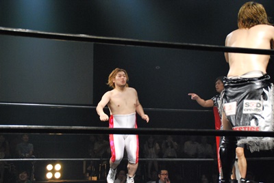 平田がドロップキックからベストストレッチプラム(右写真)。
