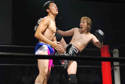 諸橋エルボー、ディーノは諸橋の股間をタッチ(右写真)。