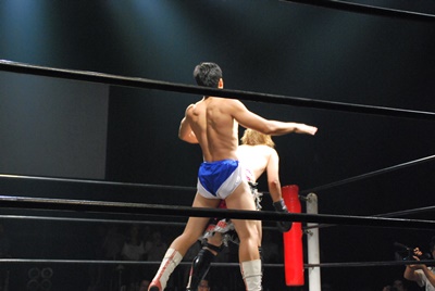 4番目のタノムサク鳥羽が入場、高梨をコーナーに詰めてパンチ連打(右写真)、