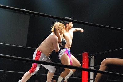 平田コーナーに振って串刺しエルボー(左写真)、コーナーに上ってミサイルキック。