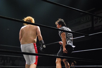 この試合のプロデューサーでありエビスコ店長のKUDOが特別レフェリー。1年間無料飲食券を持って登場(右写真)。