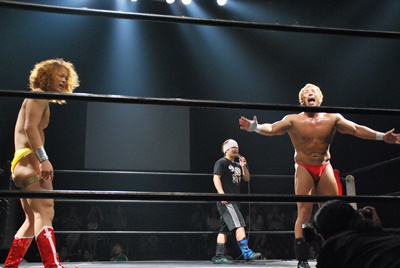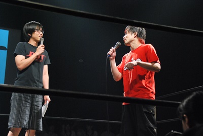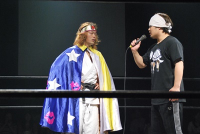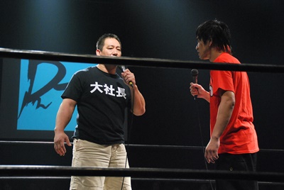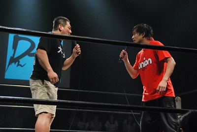 告知があるということで井上マイクリングアナと大日本の上野大会から駆けつけたイサミがリングに(右写真)。